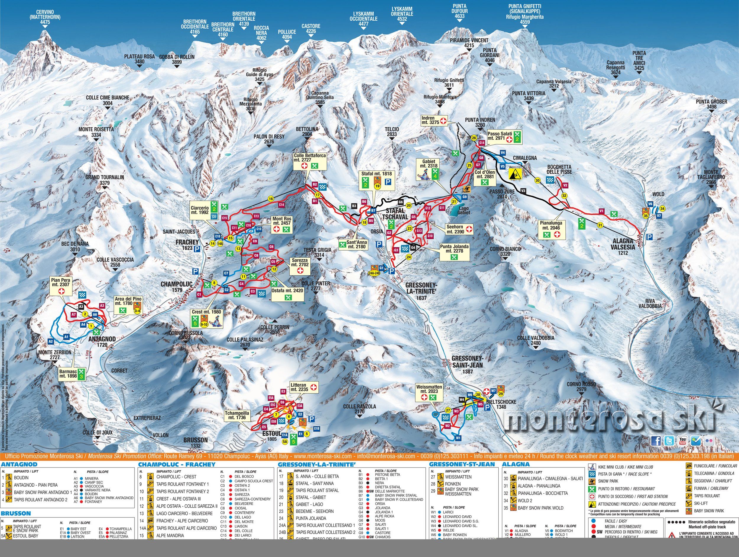 Die Orte am Skigebiet Monte Rosa bieten allen Skisportbegeisterten 175 Pistenkilometer und 39 Lifte bis auf 3.275 m Höhe. In ganz Italien findet man wohl kein anderes Skigebiet, das bekannter für sein Off-Piste-Terrain und seine diversen Heliski-Touren ist. Besonders erfahrene Wintersportler werden hier schnell vor die "Qual der Wahl" gestellt. Mit Restaurants, Cafés, Skihütten, zahlreichen Bars und Nachtclubs wird in den Orten auch ein ansprechender Après-Ski geboten.Anreise Champoluc